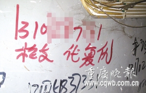 前日上午,記者在彭水縣文化館一居民帶領下,來到該館二樓轉彎處,墻上滿是“辦證”、“貸款”等牛皮癬,其中有兩塊內容最雷人:“131072×××××,迷藥、槍支”、“131072×××××,槍支、代復仇”(右圖)。