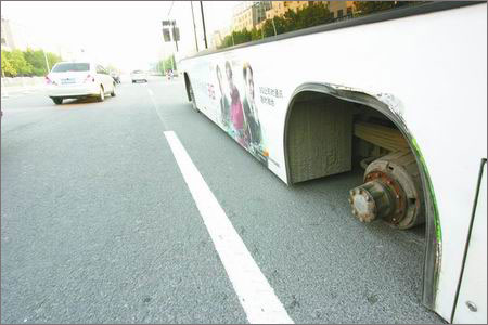 昨天下午6時(shí),記者在大學(xué)路與長(zhǎng)江路交叉口北約300米路西看到,車牌號(hào)為豫A90518的53路空調(diào)公交車車頭朝南,停在快車道上。其左后位置傾斜,車體觸及地面,車后的路面被劃出兩道約20米長(zhǎng)的傷痕。兩個(gè)脫落的車輪放在公交車右側(cè)的花壇旁。在公交車內(nèi),一男一女兩人正在談?wù)撎幚硎乱恕?/p>