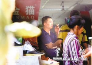 在1995年曾發(fā)生特大火災(zāi)的朝天門(mén)第三交易區(qū)6區(qū),一男子坐在自家衣褲攤前,叼根煙準(zhǔn)備點(diǎn)火。老婆正在看報(bào),出語(yǔ)阻止:“不要吸煙,要遭拘留。”該男子忍了約兩分鐘,終于還是把煙點(diǎn)起了。記者靠近拍照,女?dāng)傊鳈C(jī)警,趕緊用身子阻擋丈夫,并出手把丈夫的煙頭打掉。