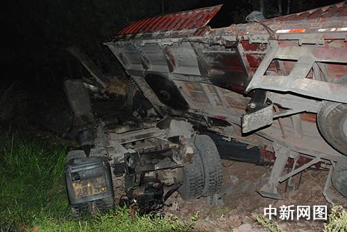 4時15分,消防隊員趕到事發(fā)路段,只見大掛車正翻倒在路旁,由于側翻時車體與地面產生摩擦非常大,掛車車頭嚴重變形,滿載的鋼筋及車體碎片散落一地,事故現(xiàn)場能清晰的看到一條磨擦印。此時,副駕座上的一男子整個身體都已被甩出駕駛室外,但是該男子頭部卻被卡在右側車窗處,經現(xiàn)場救護醫(yī)生判斷該名人員已沒有了生命體征,已經死亡。