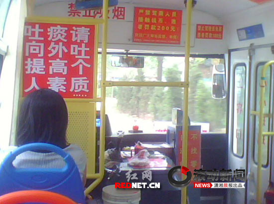 帖中附有多幅圖片,皆拍攝于公交車前門靠駕駛室的位置,在司機臺后方,有幅標語煞是顯眼,紅底,粗體白字,上面寫著:吐痰請向外吐,提高個人素質。車窗前頭有禁止吸煙,嚴禁駕駛人員觸摸錢幣等標語,還有特有的黃色鐵桿,座位,都證實這是一個標準的公交車,發帖人稱此車系江蘇宿遷的公交車。
