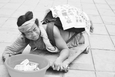 下午4時(shí)許,中年男子將自行車藏在樹后,變成一名衣衫襤褸的乞討者出現(xiàn)在眾人眼前。他趴在一個(gè)木板上,木板下邊有4個(gè)小輪子,他用胳膊和右腿支撐地面,身體通過滑板向前滑動(dòng)。他的背上還貼著一張寫有“痛苦家世”和“悲慘往事”條幅。他滿臉淚痕,伴著嗚嗚的哭聲,引來很多行人關(guān)注。記者看到,短短5分鐘內(nèi),就有十幾名市民把錢放入他面前的塑料盆中。