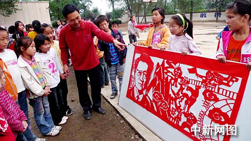 中新網伊川9月17日電(記者 齊永 通訊員 曹福川) 9月16日,伊川縣高山鄉奮進礦小學60名小學生,把老師以十首紅歌內容為主題剪成的剪紙作品展示出來,以此迎接國慶60周年的到來。
