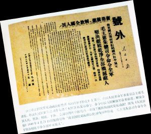 “這本書里我精選了其中的312張號外,其中有解放戰爭時期人民解放軍解放30個省會城市和許多大、中城市時發行的報紙號外,以及‘三大戰役’、渡江戰役等號外。特別是10多張開國大典號外,見證了毛主席在天安門城樓上宣告‘中華人民共和國中央人民政府已于今日成立了’的偉大歷史性時刻。”張挺自豪地說,書中收藏的大部分號外是首次面世,其中最珍貴的有兩張:一張是1949年4月21日《人民日報》出版的號外“南京國民黨政府拒絕國內和平協定毛主席朱總司令命令全軍堅決徹底干凈全部殲滅敵人”;另一張是1949年4月24日,解放軍攻入太原,當日《人民日報》出版“南京反動政府宣告滅亡狼狽奔逃我正向南京急進各界已成立治安維持委員會致電毛主席歡迎解放軍入城”的號外。