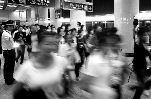 200多名4號(hào)線(xiàn)安檢員扮演的“乘客”陸續(xù)到位。11時(shí)30分剛過(guò),站臺(tái)突然斷電。就在瞬間,自動(dòng)應(yīng)急照明開(kāi)啟,但驟然降低的亮度還是在“乘客”中引起了恐慌。