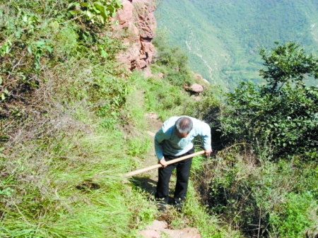 為了生計(jì),李廣耗費(fèi)兩年時(shí)間,用橛子和鐵锨鑿出一條1公里長(zhǎng)、50厘米寬的山路。