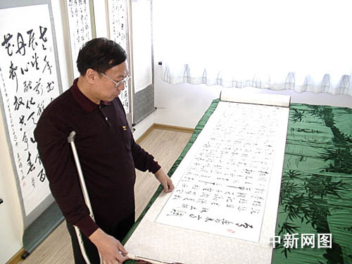 中新網烏魯木齊9月24日電(王小軍)新疆烏魯木齊一殘疾人身殘志堅,閑暇之余,拿起手中的畫筆,書寫下一幅13米長卷,獻給新中國成立六十周年。
