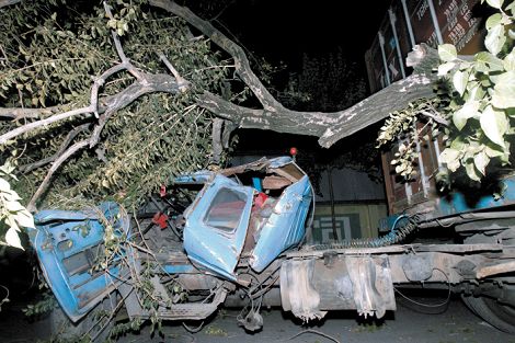 一旁,一個(gè)樹杈壓在貨車駕駛室上,使其嚴(yán)重變形,風(fēng)擋玻璃全部破碎。一棵直徑約0.8米的大樹倒在人行道上,樹根部已經(jīng)腐爛,樹冠將馬路占去了四分之三。