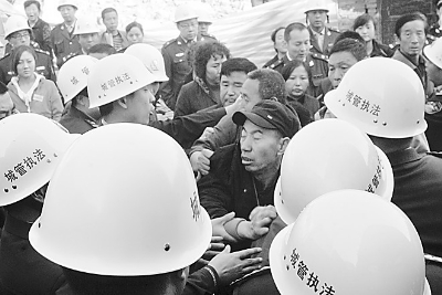 就在這時,眼看房子就要被拆掉,在一旁圍觀的3名村民顯得很激動,他們將挖掘機圍住,并將挖掘機司機拉下了車。為了防止發生意外,執法隊員站成一道人墻阻止村民進入。但是村民并沒有罷休,而是開始破口大罵,并強行沖擊人墻,試圖進入磚塊亂飛的拆遷現場,現場情況一度很緊張。在執法隊員的極力阻止下,村民才沒有沖入拆遷現場。