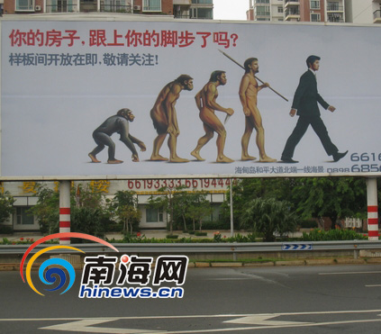(海南)海口海甸島某樓盤廣告內(nèi)容與人類進(jìn)化掛鉤,看到該廣告的市民都覺(jué)得受了莫大的侮辱,認(rèn)為該廣告有辱公民道德風(fēng)尚,要求相關(guān)部門依法取締并查處。然而記者進(jìn)一步調(diào)查發(fā)現(xiàn),該廣告已通過(guò)工商部門審批,核發(fā)了許可證,網(wǎng)友直指該廣告低俗。
