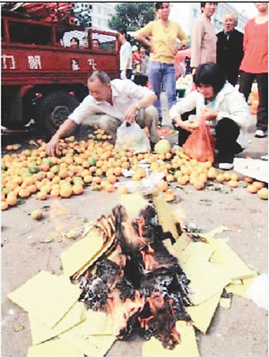 李謀輝的家人急于準備安葬老人的后事,把沒有賣掉的2輛三輪車上的柑橘、蘋果等水果作2毛錢一斤低價處理,吸引許多群眾搶購。圍觀的群眾看到這么便宜的水果,加上主人心思不在這上面,開始哄搶。有的人給了一兩元錢,更多的人則是看到沒有人問要錢,拿起水果就走人。半個小時,連買帶拿,大約700多公斤水果被一掃而空。