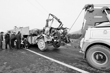 昨天下午,記者趕到西禹高速時,省公安廳交警總隊高交支隊的民警正在指揮清障車拖拉車號為陜E2679的一輛半掛貨車。這輛滿拉著鋼材的半掛貨車,駕駛室受撞擠壓成扁平狀,已被燒成黑色。如果不是右側車身伸出扭曲的車門,幾乎無法讓人判斷出這里就是車頭。省交警總隊高交支隊一大隊事故科科長楊大偉介紹,這輛車的司機和副駕駛座上的人均已當場死亡。