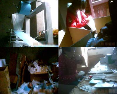 記者看到這里正在進(jìn)行包裝,在這個(gè)所謂的廠家里生產(chǎn)衛(wèi)生用品的工人們,沒有一個(gè)人穿著工作服,戴工作帽,包裝封口的機(jī)器,也是幾根木條定在一起,就湊合著用了,最出乎記者意料的,還不是這些簡(jiǎn)陋的生產(chǎn)環(huán)境,而是包裝口罩的工人極不規(guī)范的動(dòng)作,看到這個(gè)阿姨一邊蘸著唾沫一邊包裝口罩的手法,讓記者不禁為那些可能會(huì)戴上這包口罩的人感到擔(dān)心。