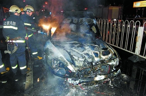 采石路消防中隊(duì)趕到現(xiàn)場時,火勢依然十分猛烈,車輛不時發(fā)出陣陣“噼里啪啦”的響聲。如果不及時控制火勢,一旦引發(fā)油箱爆炸,將威脅到過往車輛及行人的安全。消防員先使用水槍撲滅明火,清洗淌到地面上的汽油。5分鐘后,明火被成功撲滅。隨即消防員又撲滅了駕駛室內(nèi)的余火,并利用開花水槍噴灑車身進(jìn)行降溫。事故處理完畢后,長安街交通逐步恢復(fù)暢通。(記者陳坦 通訊員劉登應(yīng))