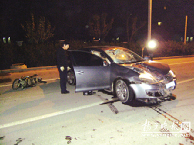 昨天凌晨,一輛大眾速騰轎車行駛到南京揚子江大道定淮門大街路口附近,突然將一名騎助力車的保安撞飛幾十米外,保安不治身亡,助力車被卡住拖行,轎車滑行幾十米后才停下,而開車男子自稱當時時速為70公里左右。事發(fā)后,目擊者稱肇事司機兩次在路邊嘔吐,且聞到一股酒味,面對眾人詢問,肇事司機否認喝酒。然而昨天下午,記者獲悉,男子因交通肇事被刑事拘留,此外還涉嫌酒后駕駛。
