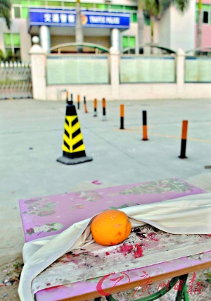 在交警中隊大樓的大堂里,陳錄生的照片仍然掛在公告欄內,相片與十幾名“初級警員”排列在同一行,但職務一欄已成空白。而在大樓對面,記者看到陳錄生家屬設置的“靈堂”仍未撤走,靈堂由一個藍色的架子搭建而成,架子下擺著一張小桌子,桌子上還有幾個水果。桌子旁邊則有一個爐子,地上還殘留著爆竹。