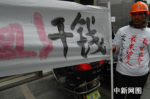 中新網貴港12月16日電 (記者 王剛)16日早,廣西貴港市數十農民工爬上該市市區最高樓盤“聯邦國際”欲跳樓討薪,情緒激動的民工還掛出“最苦農民工、最累購房人、最黑開發商”、“還我血汗錢”等橫幅聲討開發商。