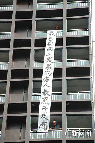 記者11時許在現場看到,30多層的“聯邦國際”二期樓盤已被掛上多條白底黑字的橫幅,內容以聲討開發商為主,其中最顯眼的是“討薪討薪步履艱辛”、“最苦農民工最累購房人最黑開發商”。 10至20層的多個窗臺上,頭戴安全帽的民工們不時高呼“黑心開發商,還我工錢”、“我要回家”等口號,樓下圍聚的數十男女民工也齊聲附和高喊。此時,有兩名女子一邊走進聯邦國際大樓一邊指指點點說:“有本事就跳下來,最好一了百了。”