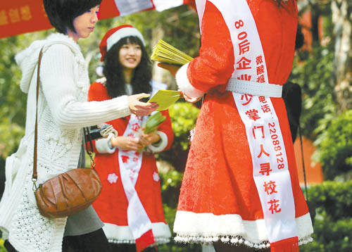 12月1日,6名漂亮女生身穿惹眼的圣誕裙裝,掛著“80后企業少掌門人尋找清純美麗校花”彩帶,在暨南大學飯堂門口派發同名宣傳單張,引得來往學子紛紛側目。斯蒂文攝