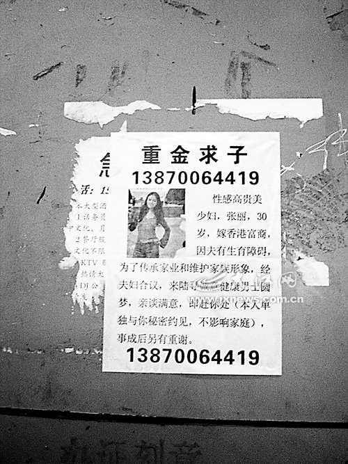 沒(méi)費(fèi)多少時(shí)間,記者便在某臨街店面的外墻上看到了這則廣告,內(nèi)容為“性感高貴美少婦,張麗,30歲,嫁香港富商,因夫有生育障礙,為了傳承家業(yè)和維護(hù)家族形象,經(jīng)夫婦合議,來(lái)陸尋誠(chéng)意健康男士圓夢(mèng),親談滿(mǎn)意,即赴你處(本人單獨(dú)與你秘密約見(jiàn),不影響家庭),事成后另有重謝”,廣告上還配有一張美女全身照,更是吸引了不少市民的眼球。圍觀市民為此議論紛紛,有的說(shuō)可能是真的,現(xiàn)如今無(wú)奇不有;還有的說(shuō),這種事怎么可能廣而告之,肯定是騙子設(shè)的圈套。