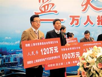 據(jù)介紹,青浦此次舉行的“慈善一日捐”活動募得的善款,是該區(qū)歷年募捐總額的2.8倍,創(chuàng)歷史新高。在參與捐贈的700余家單位中,景港控股集團(tuán)捐贈1000萬元;青浦工業(yè)園區(qū)、上海徐涇建筑工程有限公司、上海豪都房地產(chǎn)開發(fā)經(jīng)營有限公司等18家單位捐贈了100萬元以上。(談燕)