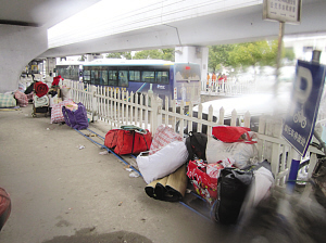 市場關(guān)門放假之后,那些滯留在門口的民工只好收拾好行囊,和其他工友聯(lián)系住處。一位安徽籍民工告訴記者,他和其他幾個(gè)老鄉(xiāng)準(zhǔn)備去另一個(gè)老鄉(xiāng)打工的工地那里暫時(shí)住兩天。放假了工地也停工,但是住的地方還是有的。而還有一些民工索性又將行李搬到了安德門地鐵站附近的高架橋下,“現(xiàn)在工作也不好找,住旅館實(shí)在太貴,我們只好再住回高架橋下。”民工們搬進(jìn)高架橋下后,個(gè)個(gè)哀聲嘆氣,但也有一些情緒樂觀的,跑進(jìn)了地鐵站內(nèi)打撲克取暖消遣。(記者 曹盧杰 裴睿)