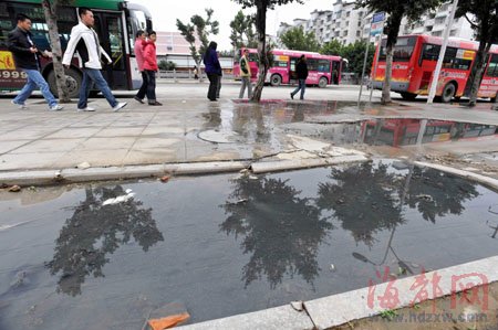 昨天下午,記者在現(xiàn)場看到,水坑大約有十幾平方米,隱隱有酸臭味撲面而來。“這幾天剛下過雨,氣味已經(jīng)好了很多。”業(yè)主周先生 說,年前氣溫高的那兩三天,臭味能熏到三四十米開外的樓層,許多住戶大熱天不敢開窗。記者注意到,這個水坑正好位于108公交車的終點站,距離站牌不過三四米。因此,附近居民等車時,不得不挨著水坑,碰到上下班高峰期,常有人被擠到坑里,弄得一身酸臭。
