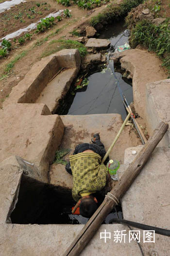 小劉凱告訴記者,受持續(xù)干旱缺水影響,他到村莊到遠處取水已經有一周時間了。由于供村里食用的水源在慢慢減少,每天中午放學后,劉凱都要擔著自己的“水桶”到遠地“打水”,往返需要近半個多小時。據記者上前仔細察看,小劉凱取水之地作為村里為數不多的水源之一,渾濁的水面難以見底,水源質量令人擔憂。