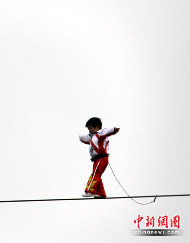 今日此間,“小燕子”在同門師哥表演過“自行車空中花樣表演”后,不足1米高的她站在10米高臺上。在眾人期待下,“小燕子”謹慎的邁出了第一步,眾人的心一下子提到了嗓子眼!果不其然,自行車“開道”后,在鋼絲上剛剛邁出兩步的“小燕子”就被迫來了個“金雞獨立”,花了4秒鐘時間揮舞雙手才得以保持平衡。