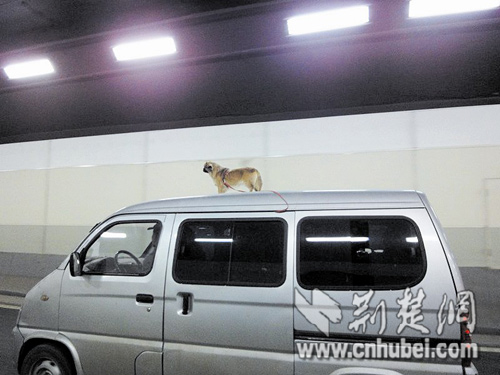 在一輛快速行駛的面包車(chē)的頂上,站著一只小狗。昨日,一組標(biāo)題為“武漢長(zhǎng)江隧道內(nèi)虐狗門(mén)事”的照片出現(xiàn)在網(wǎng)上。