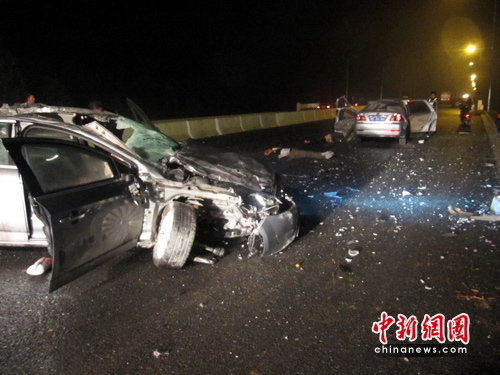 當天晚上21時20分,北海市消防官兵接警到達位于北鐵收費站往鐵山港方向500米處的事故現場后,見一輛車牌號為滬J86981的福特轎車橫擺在公路中間,車頭破碎不堪,車體頂部面目全非。在距離該車10米左右,一輛車牌號為桂E36186的力帆轎車亦直擺在公路邊上,車頭和車體也存在不同程度的破損。同時公路上還灑滿了零零星星的玻璃碎片和車體殘片,地上躺著被甩出車外二男一女已當場死亡。而兩車的駕駛員分別被困在駕駛室,動彈不得。