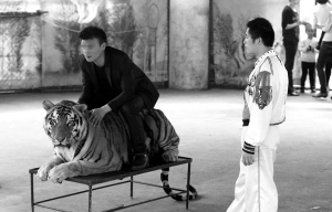 這時,在臺上站著4名穿著工作服的男性工作人員,其中1人負責拍照,其他3人看守老虎,此外還有一名女性工作人員在邊上幫忙吆喝并收取每次30元的合影費。