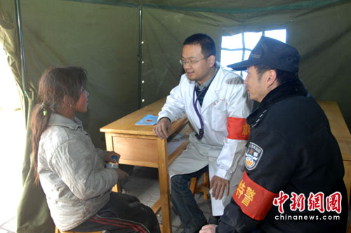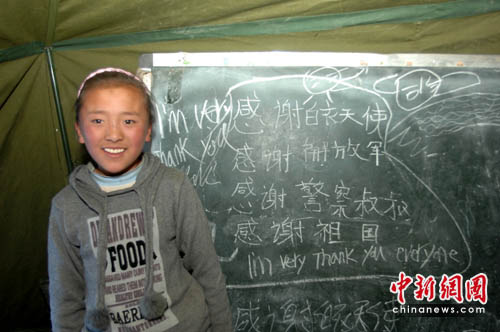 看到特警隊(duì)員們搭好了帳篷、送來了水果,第二完全小學(xué)的學(xué)生們眼含淚水,激動(dòng)地拍手感謝:“謝謝成都來的警察叔叔!”可愛的藏族小女孩文茂拿著粉筆在帳篷里的黑板上重重地寫下“感謝警察叔叔、感謝祖國、感謝你們每個(gè)人”。正在這里學(xué)習(xí)唱歌的十七、八個(gè)3、4年級的小學(xué)生也不約而同地為特警隊(duì)員表演了他們這兩天才學(xué)會(huì)的歌舞——“感恩的心,感謝著你……”同時(shí),成都特警支隊(duì)的隨隊(duì)醫(yī)生又和成都市第三人民醫(yī)院的醫(yī)生劉雁軍一起,開了“小診所”,為這里患病的學(xué)生進(jìn)行診治,還送上了藥品和飲用水。(完)