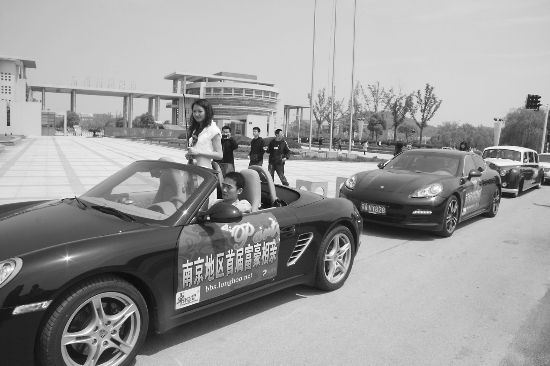 昨天上午9點多,3輛保時捷跑車依次駛至位于新模范馬路旁邊的南京郵電大學東門,每輛車的兩側車門均貼有大幅廣告,上面寫有“南京首屆富豪相親會”字樣。3輛名車停在路邊后,立即引來了無數路人圍觀,“平時在街頭偶而會看到一輛名車,3輛清一色的保時捷名車排在一起,真是少見!”市民程先生咂了咂嘴。