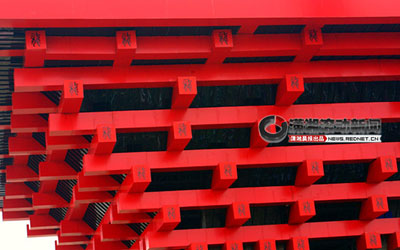 帖子描述說,這座紅色的建筑高24米,四方形的平臺邊長50米。上部是四方冠形結構,外頂部邊長43米,其6層架空層全部為鋼架結構;下面還有四個鋼筋混凝土大立柱。整個建筑在結構、色調和外形等方面都和世博會中國館相似。