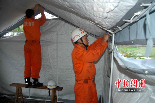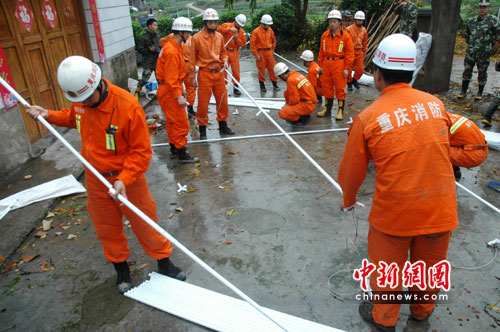 在重慶市墊江縣李白村九組,一頂藍色的救災帳篷經過消防官兵的緊張搭建成形,災民湯強上前與消防官兵們緊緊握手,感激得熱淚盈眶……