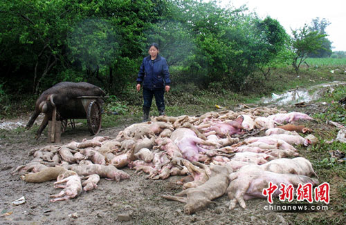 翁源縣官渡養豬場老板林德富告訴記者,6日晚11時左右,暴雨使得水勢迅速在整個養豬場蔓延,造成損失至少1200多頭豬。面對被洪水沖得一片狼藉的養豬場,這個56歲的漢子忍不住蹲在地上掩面而泣。