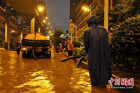 在“水浸黑點”之一中山一路現(xiàn)場,有多位環(huán)衛(wèi)工人被臨時抽調(diào)過來協(xié)助排水,其中一位工作人員黃叔對筆者說:“雨下的這么大,市政也沒有辦法,只能派抽水車過來協(xié)助排水,已經(jīng)來回好幾趟了,但是還沒能那么快抽完。這水還不知道什么時候才能退。”“我們是臨時抽調(diào)過來協(xié)助排水的,已經(jīng)加班了好幾個小時了。”黃叔一臉無奈的說。