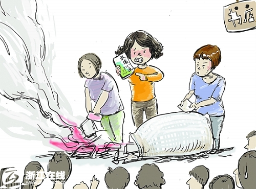 店主看到了過來阻攔,雙方發(fā)生了爭執(zhí)。很快,警察來了。百官派出所的金警官向記者證實,當(dāng)時雙方的情緒都很激動。說起燒書,家長說,這實在是無奈之舉,“這樣的書不應(yīng)該在校門口賣,影響孩子的學(xué)習(xí)”。而店主則稱,他們是借給大人看的,這樣燒書影響他們的生意。