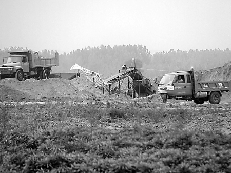 耕地已被毀,機械穿梭忙,振動篩正在向車上裝沙