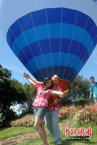 全國的30支熱氣球隊(duì)來助興。在海口萬綠園上空漂游的熱氣球上,北京的劉先生突然“變出”一枚鉆戒向女友求婚。他笑著說,從網(wǎng)上看到海口旅游婚慶的消息就瞞著女友報(bào)了名,為的是上演在熱氣球上求婚一幕。