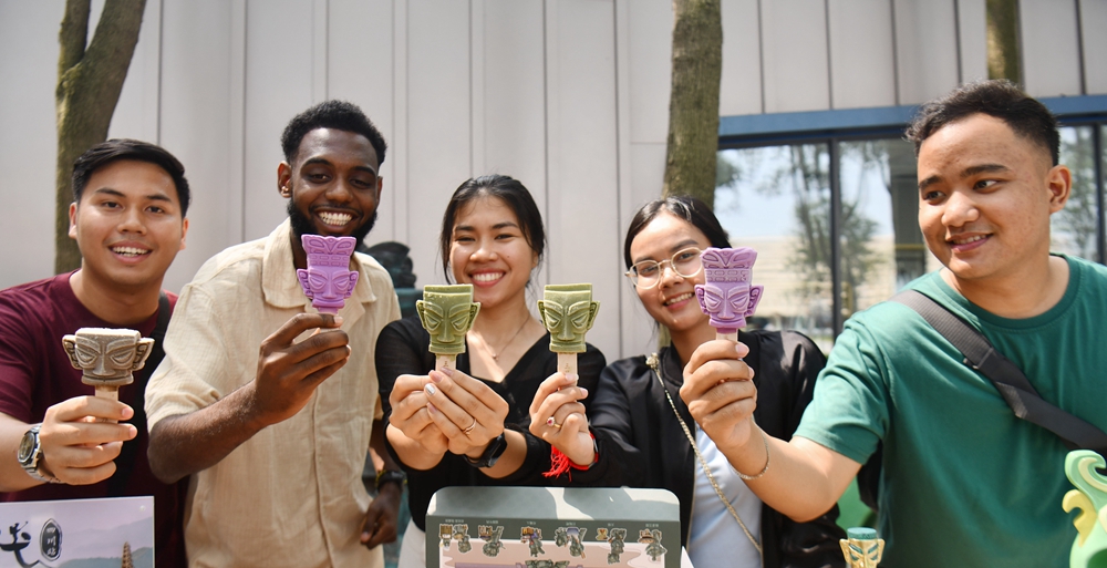 近日,來自柬埔寨、古巴、馬來西亞、菲律賓的五位外國(guó)青年,跟隨“‘Z世代’畫像中國(guó)”網(wǎng)絡(luò)互動(dòng)活動(dòng)來到四川省廣漢市三星堆博物館,認(rèn)真了解歷史,記錄精美文物,感受古蜀文明。同時(shí),大家還打開了三星堆主題盲盒,品嘗了三星堆文創(chuàng)冰淇淋,收獲滿滿。