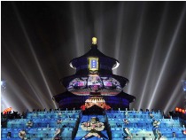 照耀在2012新年陽光里的長春凈月潭國家森林公園,銀裝素裹,65米長主雪雕“瓦薩天使”等冰雪藝術(shù)作品將這里裝扮成一個童話般的世界。東北健身秧歌、健身腰鼓等具有濃郁東北地方特色的表演在現(xiàn)場為火炬?zhèn)鬟f助興。