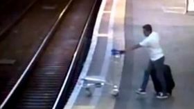 監拍男子將小車推入軌道逼停火車驚險一幕