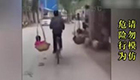 男子挑扁擔帶倆娃騎車前行