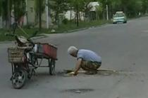 七旬老人義務修補坑洼路面