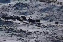 成群野牦牛在高原雪地“漫步”