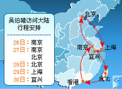 應(yīng)中共中央和中共中央總書記胡錦濤的邀請(qǐng),吳伯雄主席將率中國(guó)國(guó)民黨訪問團(tuán)于5月26日至31日來南京、北京、上海訪問。吳伯雄已將此行定位為“工作會(huì)談”[詳細(xì)]