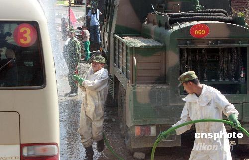 ·圖:北川災區為進出車輛實行嚴格消毒(7月6日 14:13)