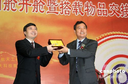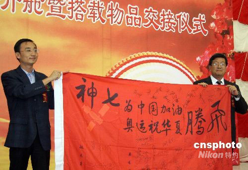 ·圖:“神七”載人飛船總設計師張柏楠移交返回艙搭載簽名旗幟(10月1日 17:36)